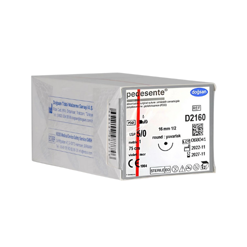 D D2160 Pedesente, hassas cerrahi işlemlerde kullanılan, yuvarlak uçlu iğneye sahip bir cerrahi süturdur. 5/0 incelikte, 16 mm uzunluğunda ve 1/2 dairesel iğne yapısına sahiptir. 75 cm uzunluğundaki ipi, güvenli ve dayanıklı dikiş imkanı sunar.