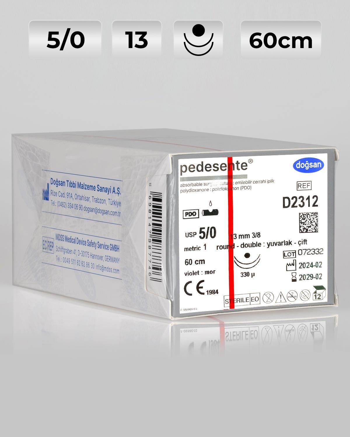 D D2312 PEDESENTE 5/0 13MM 3/8 60CM YUVARLAK ÇİFT İĞNELİ CERRAHİ SÜTUR İPLİK MOR PDO