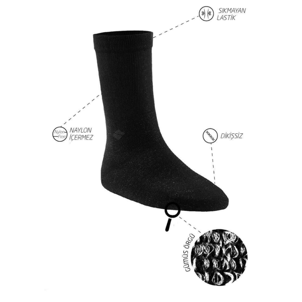 Termodinamik özelliği sayesinde vücudunuzdan çıkan ısı enerjisinin %95 ini kaynağına geri yansıtır ve termal enerjiyi depolayıp dağıtır.Böylece ayağınızı soğuk havalarda sıcak tutar.Gümüş iplik ısı iletkenliği sayesinde sıcak ortamlarda ayağınızdaki ısıyı dış ortama dağıtır böylece ayaklarınızı serin tutar.Ayaklarınız kışın üşümez, yazın terlemesin,