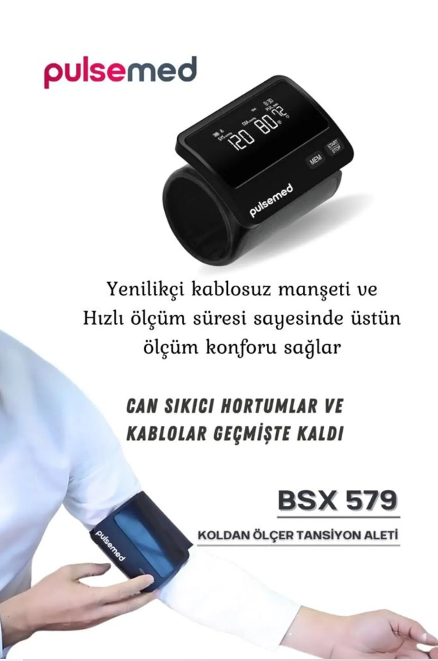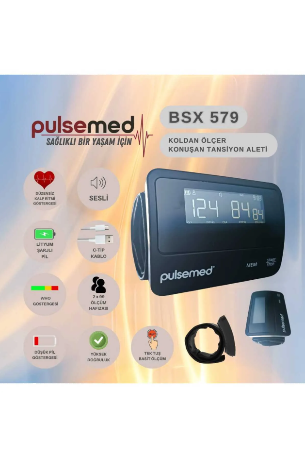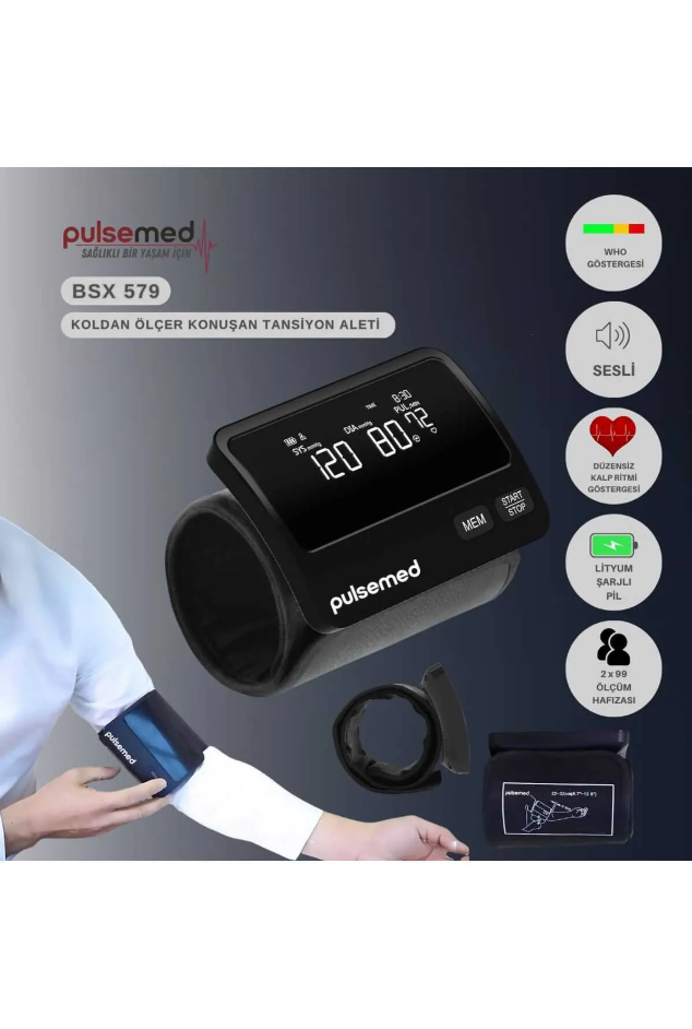 Pulsemed BSX579, koldan ölçüm yapan, Türkçe sesli yönlendirme özelliği sayesinde özellikle yaşlılar ve görme problemi yaşayan bireyler için büyük kolaylık sağlayan gelişmiş bir tansiyon cihazıdır. WHO renk skalası, aritmi tespiti, geniş ekran ve çift kullanıcı hafızası gibi detaylarla, hem pratik hem güvenilir bir ölçüm deneyimi sunar.