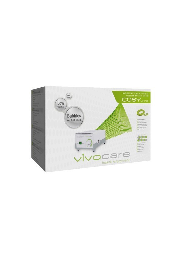 .Vivocare Cosy Ultra ayarlanabilir pompaya sahiptir. Anti-dekübitustur yani yarattığı masaj etkisiyle dokuyu oksijenle besler ve yatak yaralarının oluşmasını engeller. Baklava dilimli yapısı sayesinde yara oluşumunu engellemede en etkili yöntemdir. Hastanın ağırlığına göre basınç ayarlama özelliği vardır. Kolay temizlenebilir aksesuarları bulunur. Yapımında delinmelere karşı güçlü toksik olmayan PVC kullanılmıştır. .Daha az ses, daha az titreşim özelliği mevcuttur. Şişme yatak üzerindeki baloncuklar sayesinde dalgalı pompalama sağlar.
